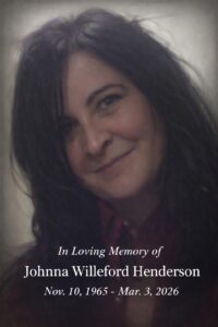 Johnna Marie Henderson, age 60, of DeWitt, Arkansas went to be with the Lord on March 3, 2026. She was born in Little Rock on November 10, 1965 to Marvin Edgar “Eddie” Willeford and Josie Marie Johnson Willeford.